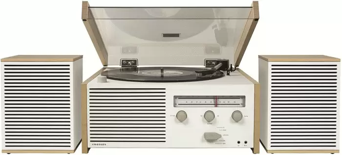 La simplicidad se combina con la funcionalidad en el sistema de tocadiscos todo en uno Switch II. Con reminiscencias de la arquitectura modernista, el tocadiscos Switch II ofrece un diseño despejado inspirado en mediados de siglo repleto de la tecnología actual. El cuerpo blanco rígido presenta perillas de color gris mate que se combinan a la perfección y complementan el gabinete de chapa rubia. Los altavoces a juego se asientan sobre cuatro pies de goma e integran el mismo patrón de rejilla de altavoz horizontal que el tocadiscos. La perilla de función le permite cambiar fácilmente entre la radio AM/FM, la reproducción de vinilo, la entrada auxiliar y el receptor Bluetooth® incorporado que le permite transmitir música digital a través de los altavoces del tocadiscos. Use la palanca de entrada para dejar caer suavemente el cartucho magnético móvil sobre su disco y marque la velocidad con la perilla de control de tono si es necesario. La tapa de plexiglás mantiene el polvo a raya y puede abrirse o cerrarse mientras reproduce su vinilo.