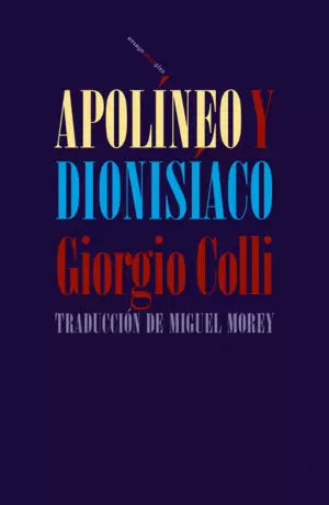 Inédita hasta el momento en español, Apolíneo y dionisíaco recoge varios textos de Colli escritos en la época de Platón político y Filósofos sobrehumanos, apuntes en los que, profundizando en la fértil dupla conceptual nietzscheana de lo apolíneo y lo dionisíaco, y llevándola un paso más allá (de lo estético a lo teorético), el gran filósofo y filólogo italiano insiste en algunos de los temas clave de su carrera: el misticismo griego del siglo vi a. C., la restitución de los presocráticos como filósofos del ser humano y no de la naturaleza, las tensiones entre la expresión finita (apolínea) y la interioridad infinita (dionisíaca), etcétera, y lo hace con esa fascinante y erudita lucidez preñada de sentidos, que esboza y señala nuevos caminos de pensamiento.