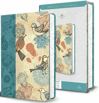 Biblia tamaño manual, ultrafina y con letra gigante de 14 puntos. Piel azul con pájaros, cinta marcadora y fotos a color de Tierra Santa.