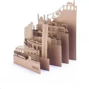 Postal-skyline desplegable fabricada en cartón kraft que recrea cada ciudad en un escenario en miniatura. Puede usarse como postal, guía de anotaciones de viaje o como recuerdo para llevar a casa. El packaging incluye una tarjeta descriptiva en papel reciclado en la que se identifican cada uno de los edificios y motivos de la postal. Empacada en bolsa resellable.