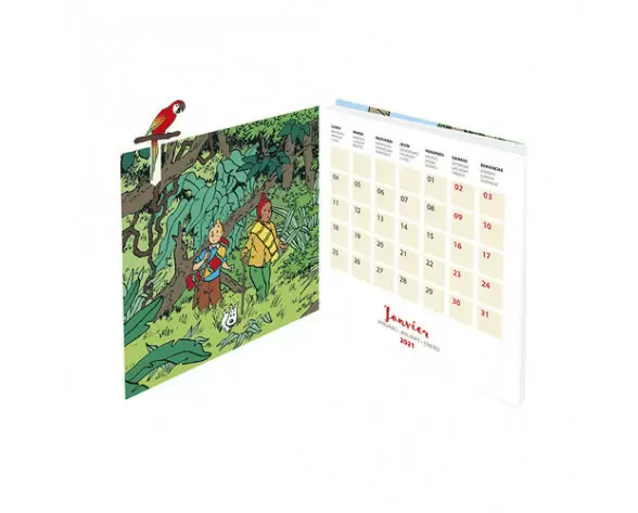 Calendario pequeño de sobremesa para el 2021, ideal para tenerlo en el escritorio de casa o el trabajo, con imágenes de Las aventuras de Tintín. Los doce meses del nuevo año van acompañados con viñetas de los álbumes creados por Hergé en escenarios de naturaleza: junglas, ríos, montañas, islas