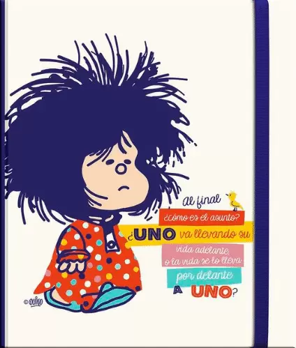 Libreta de tapa dura con acabado mate, relieve, incluye 80 hojas de papel de bambu color crema de 100 gramos con , incluye bolsillo y cinta marcadora, Ilustraciones de Mafalda